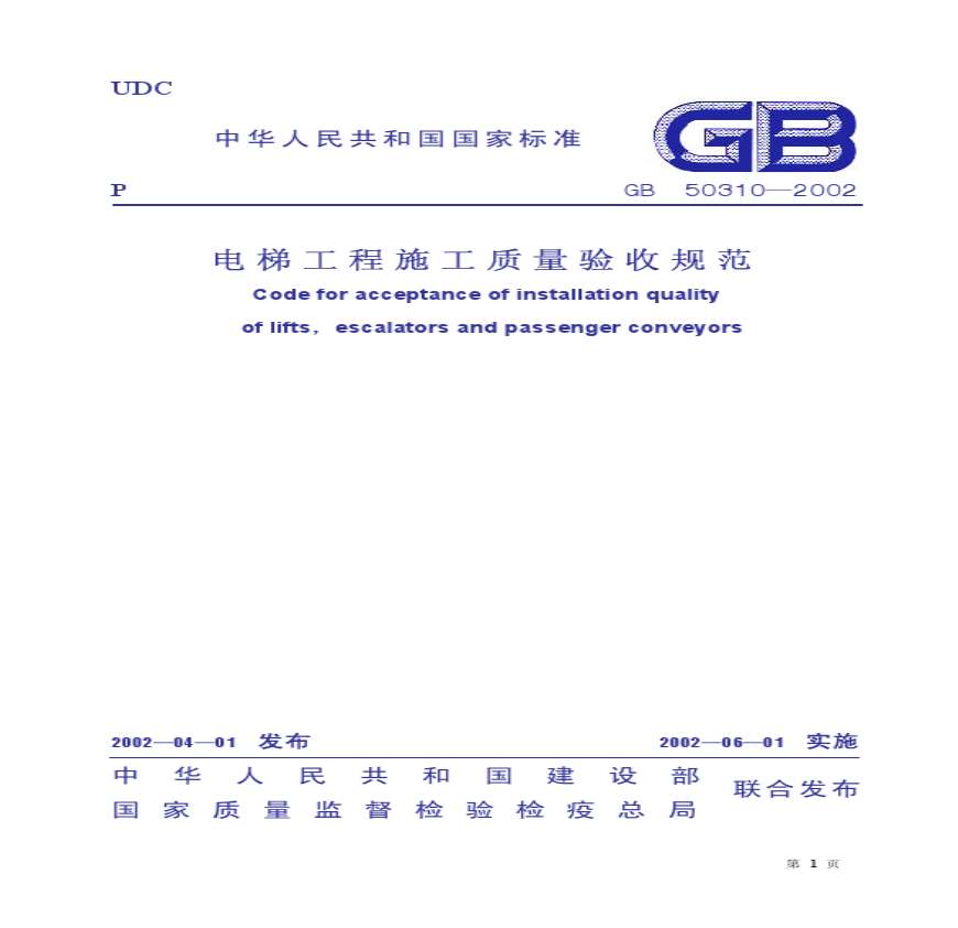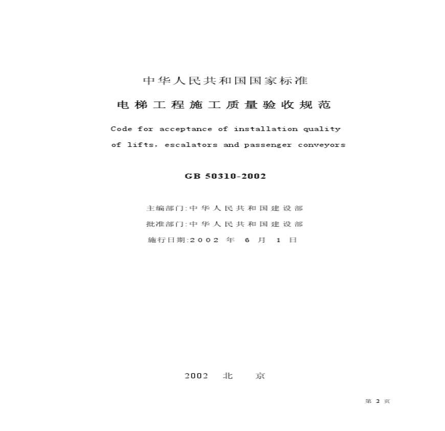 > 00801电梯工程施工质量验收规范GB50310-2002