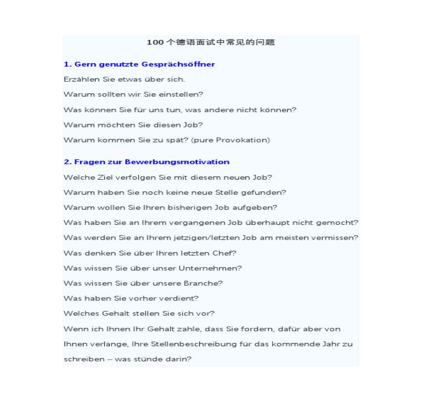 100个德语面试中常见的问题资料下载,喜欢的朋友可以下载收藏!