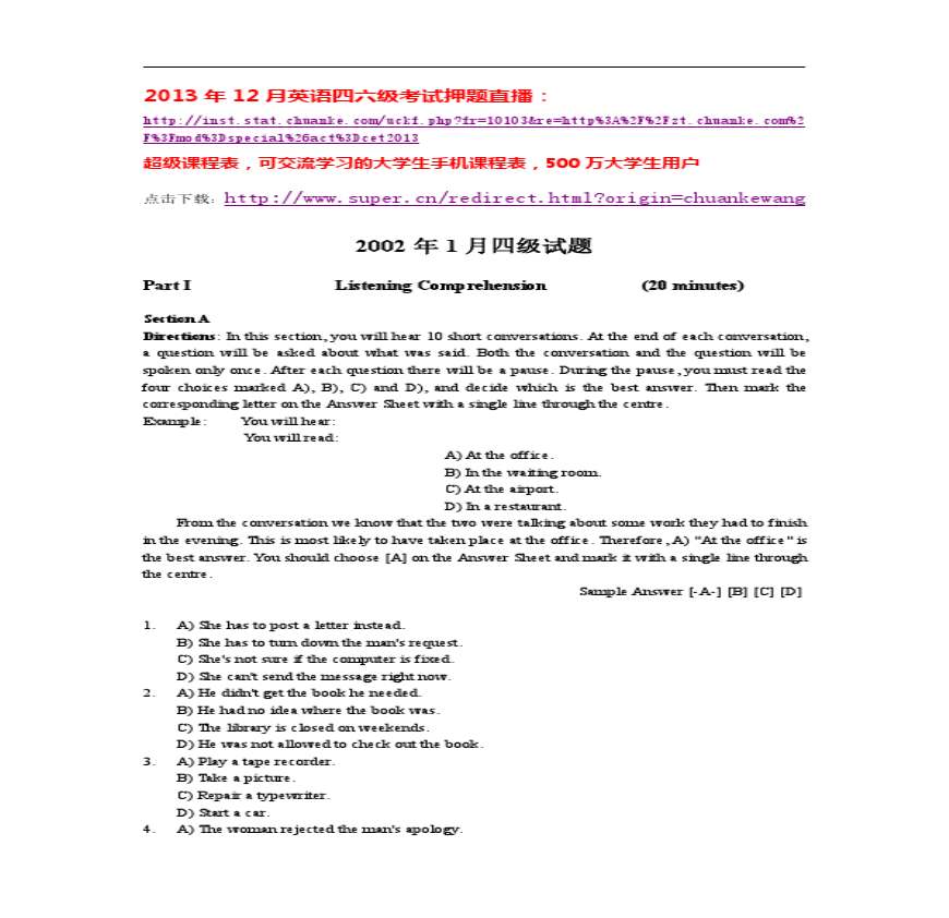 2002年1月英语四级真题及答案资料下载,喜欢的朋友可以下载收藏!
