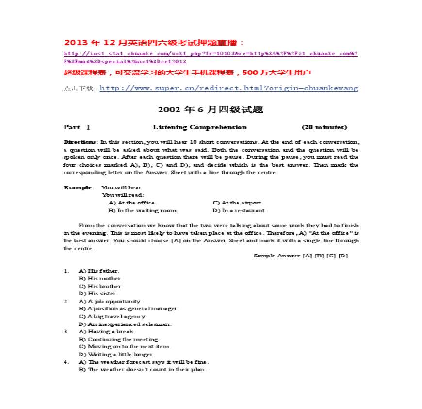 2002年6月英语四级真题及答案资料下载,喜欢的朋友可以下载收藏!