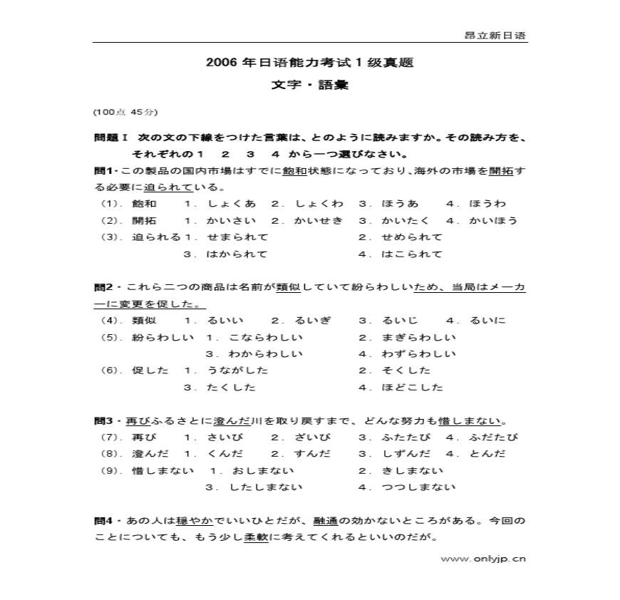 2006年日语能力考试1级真题-文字词汇.pdf 免费下载