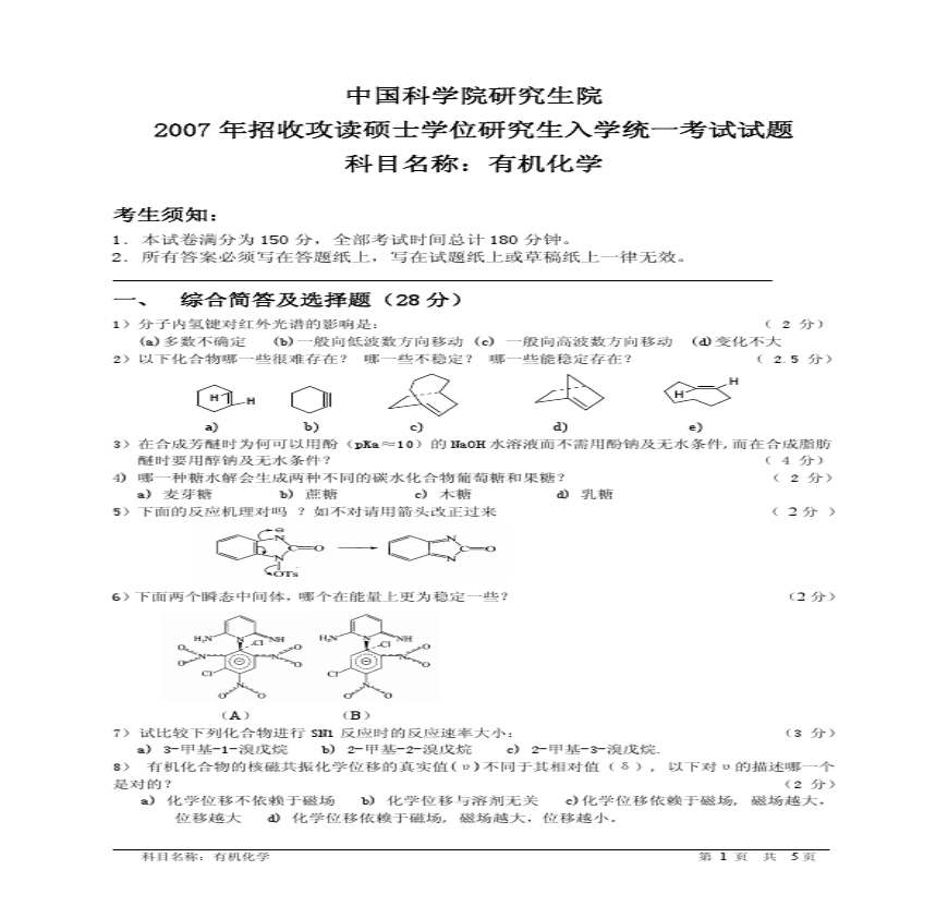 2011年研究生入学考试有机化学试题