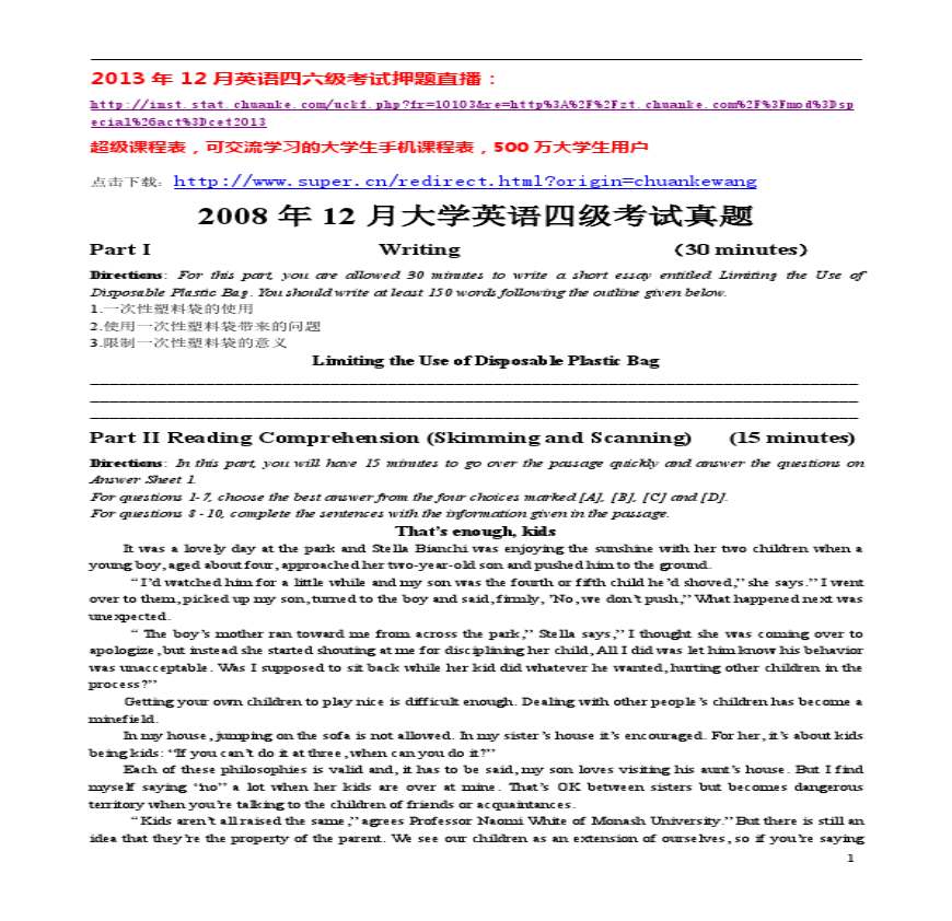 2008年12月英语四级真题及答案资料下载,喜欢的朋友可以下载收藏!