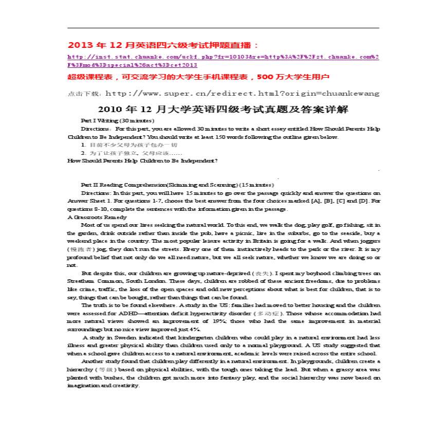 2010年12月英语四级真题及答案资料下载,喜欢的朋友可以下载收藏!