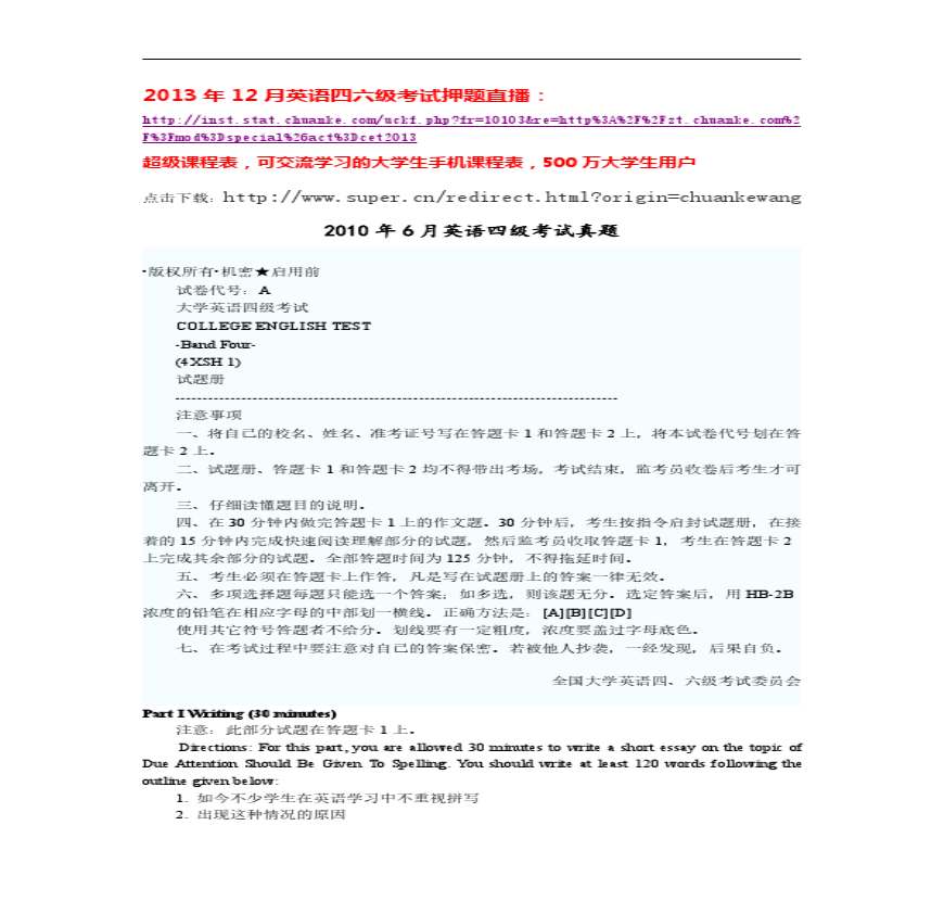 2010年6月英语四级真题及答案资料下载,喜欢的朋友可以下载收藏!