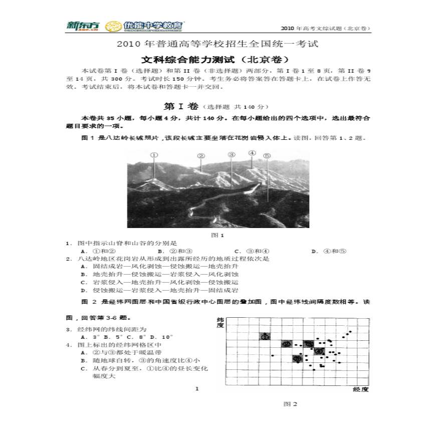 含答案年月日 学习资料页 真题:学习资料页 中国权威信息资源门户 绝密★使用完毕前普通高等学校招生全国统一考试能力测试()本第I卷(选择题)和 学习资料页 年普通高等学校招生全国统一考试年普通高等学校招生全国统一考试能力测试文科综合能力测试文科综合能力测试能力 学习资料页 年北京文综卷地理高考试题解析图是八达岭长城照片该段长城主要坐落在花岗岩侵入体上。