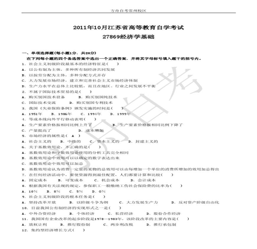 2011年10月《经济学基础》27869考试真题资料下载,喜欢的朋友可以下载收藏!