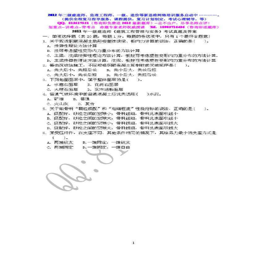 2011年一级建造师《建筑工程管理与实务》考试真资料下载,喜欢的朋友可以下载收藏!