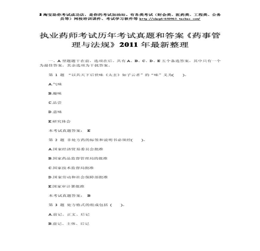2011年最新整理执业药师考试历年考试真题和答案《药事管理与法规.pdf 免费下载
