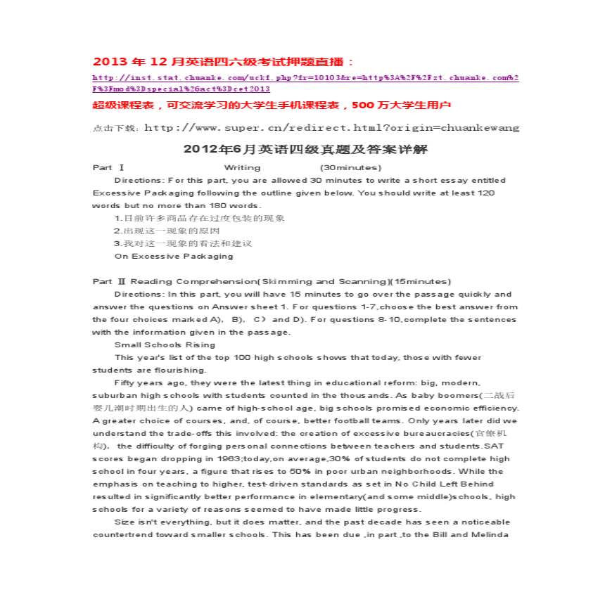 2012年6月英语四级真题及答案资料下载,喜欢的朋友可以下载收藏!