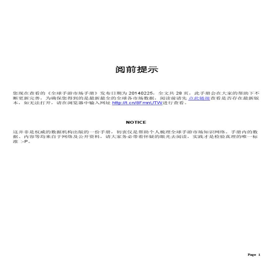 P 阅前提示您现在查看的《全球手游市场手册》发布日期为,全文共页,此手册会在大家的帮助下不断更新完善,为确保您得到的是最新