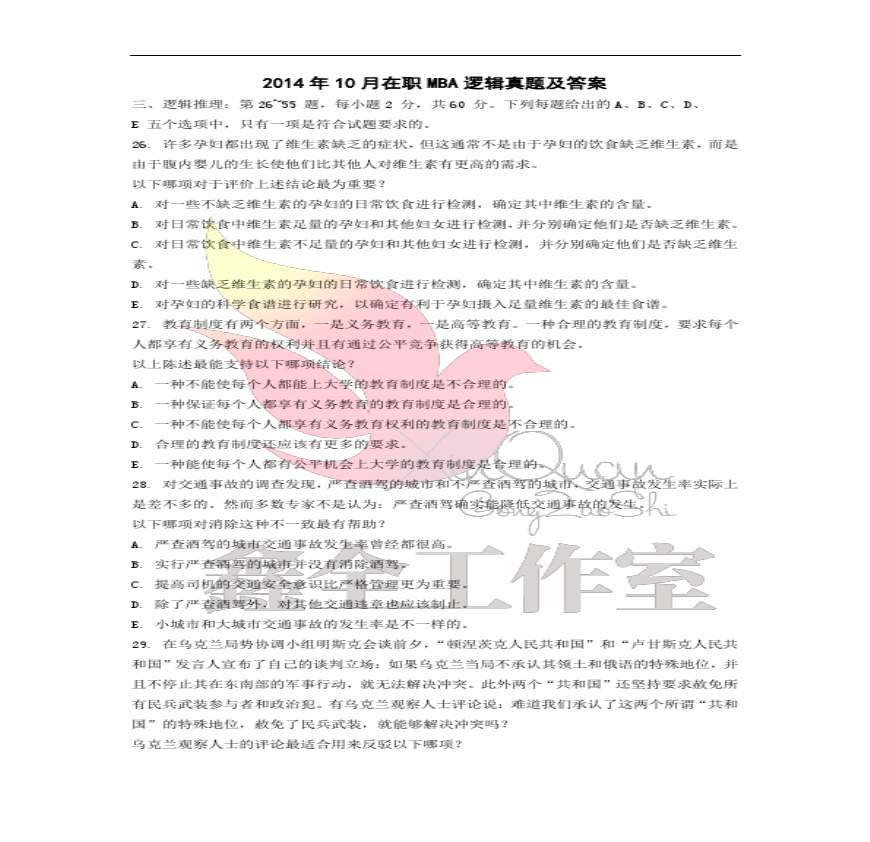 2014年10月在职MBA逻辑真题及答案资料下载,喜欢的朋友可以下载收藏!