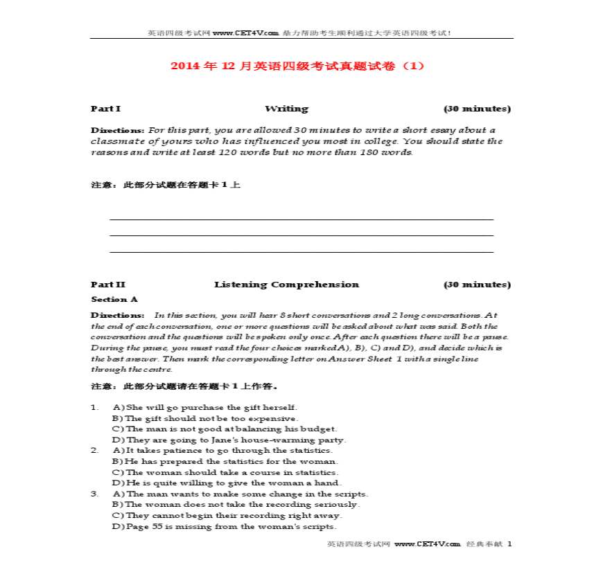 2014年12月英语四级真题试卷(第1套)资料下载,喜欢的朋友可以下载收藏!