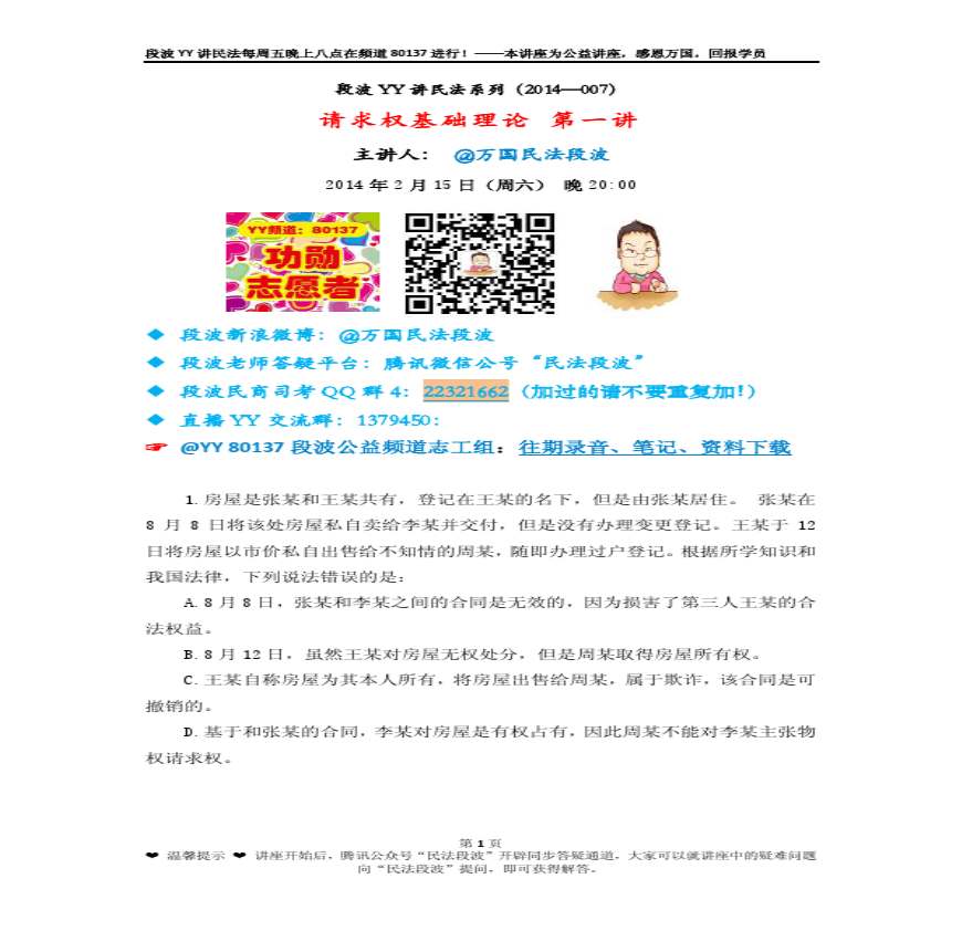 2014赛季段波YY讲民法讲义007下载打印版资料下载,喜欢的朋友可以下载收藏!