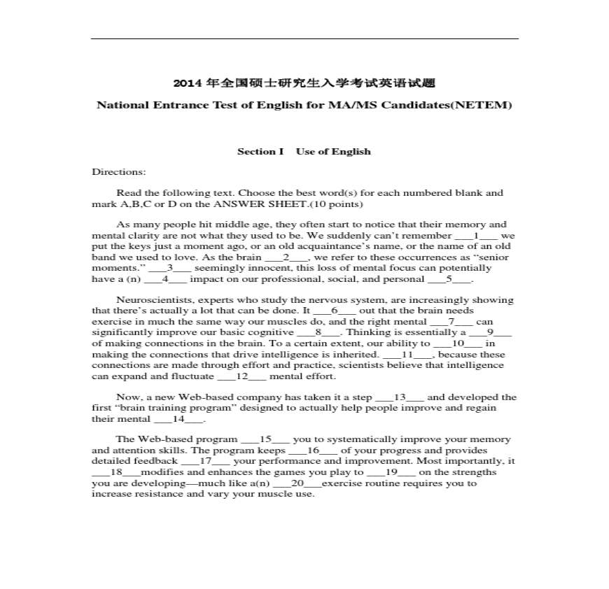 2014研究生考试英语一真题资料下载,喜欢的朋友可以下载收藏!