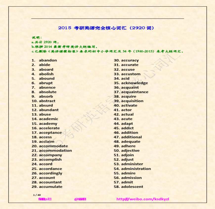 2015考研英语必备完全核心词汇(根据最新《2014考研英语大纲》及《英语课程标准编写》资料下载,喜欢的朋友可以下载收藏!