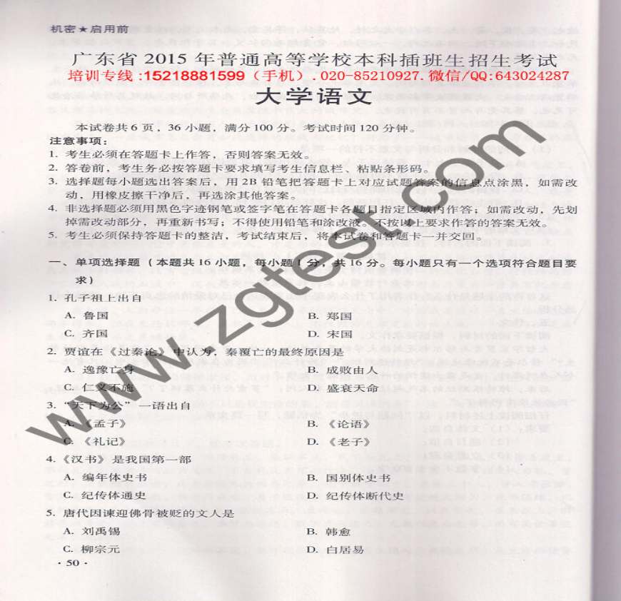 2015年广东专插本考试《语文》考试真题资料下载,喜欢的朋友可以下载收藏!