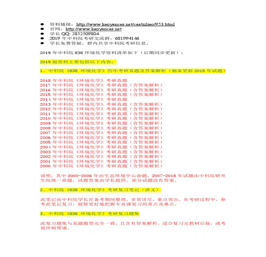 2019年中国科学院838环境化学考研真题及答案资料 清单资料下载,喜欢的朋友可以下载收藏!