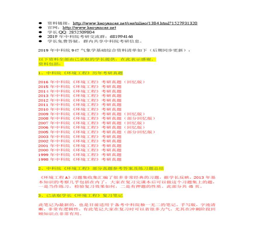 2019年中国科学院927环境工程考研真题及答案资料 清单资料下载,喜欢的朋友可以下载收藏!