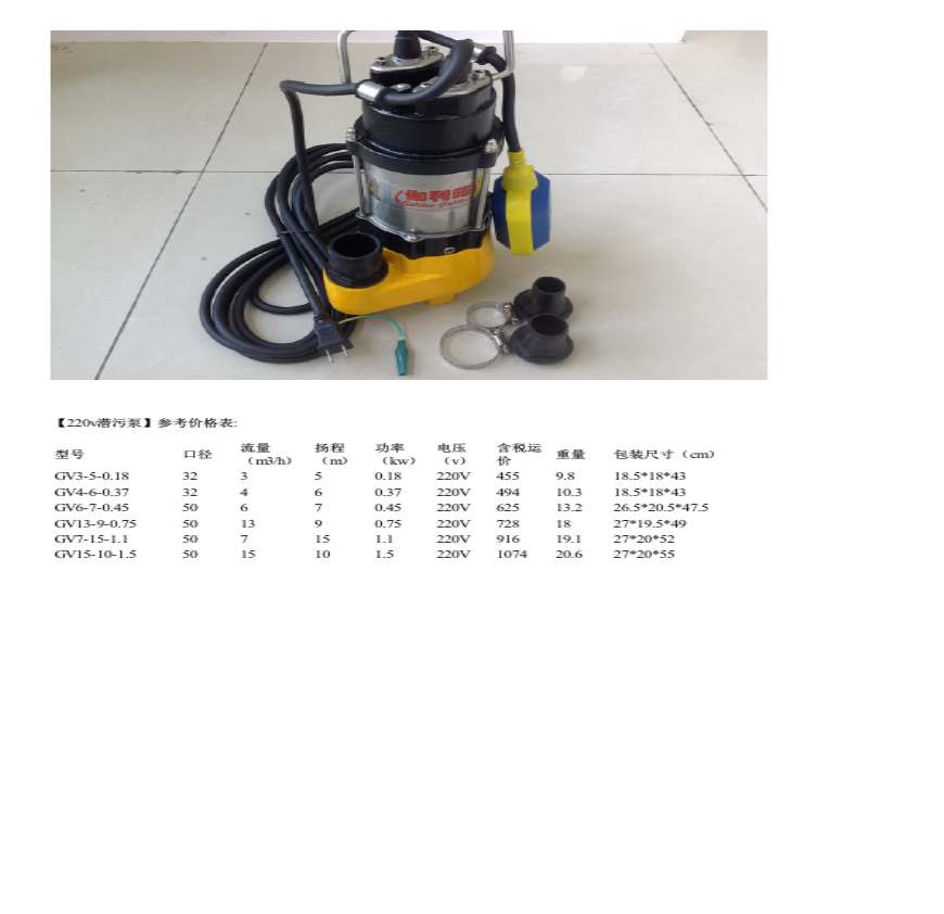 【高扬程潜水】产品: GV型潜水排污泵是国内新形排水工具,相同的泵配V两种电压,可供家庭及工业