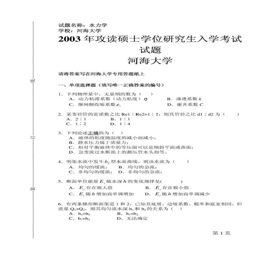 %28含答案%29河海05年水力学考研真题资料下载,喜欢的朋友可以下载收藏!