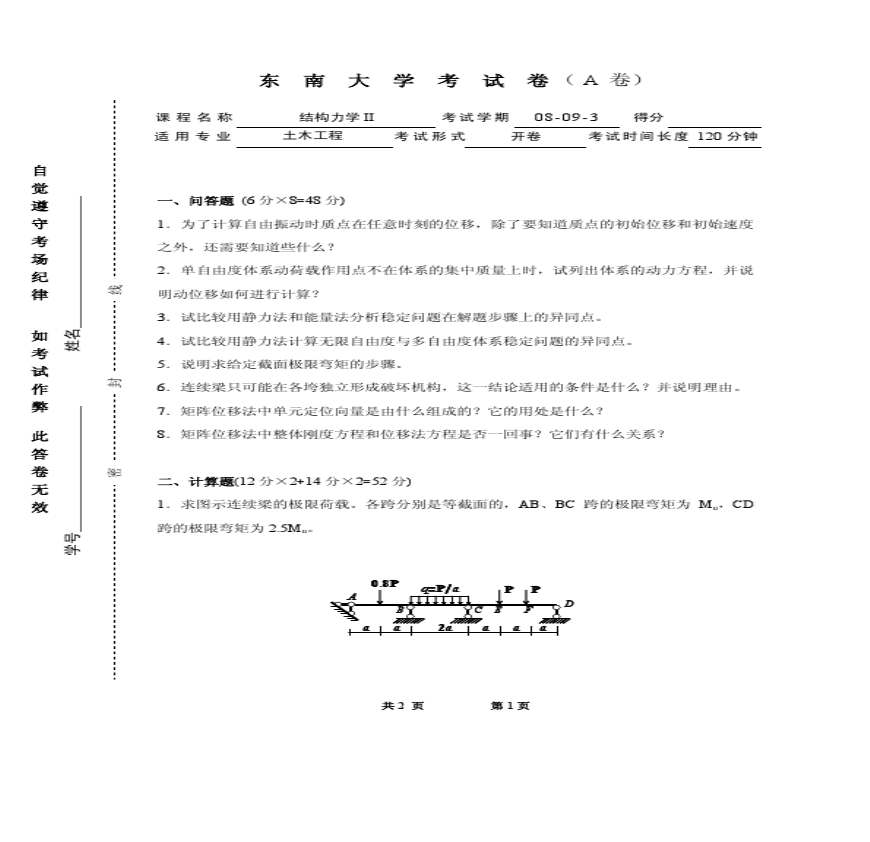 3(土木工程专业)结构力学II考试试卷资料下载,喜欢的朋友可以下载收藏!