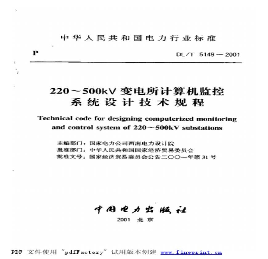 DL 5149-2001 220~500kV变电所计算机监控系统设计技术规程资料下载,喜欢的朋友可以下载收藏!