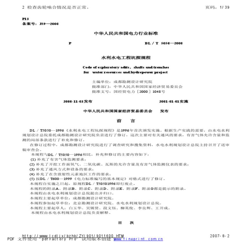 DL/T 5050-2000 水利水电工程 坑探规程.pdf 免费下载