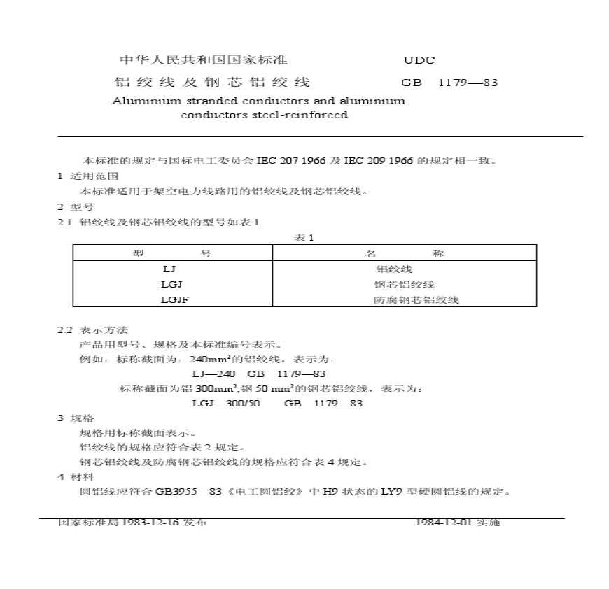 > GB 1179-1983 铝绞线及钢芯铝绞线