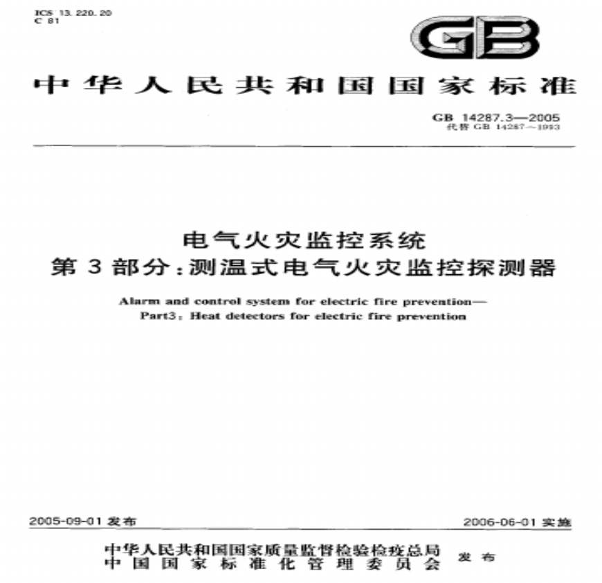 发布于;主要起草单位为公安部沈阳消防研究所;主要起草人为王玉祥、张颖 《:测温式电气火灾监控探测器》