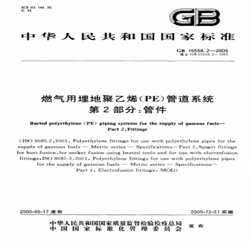 > GB 15558.2-2005《燃气用埋地聚乙烯(PE)管道系统 第2部分:管件