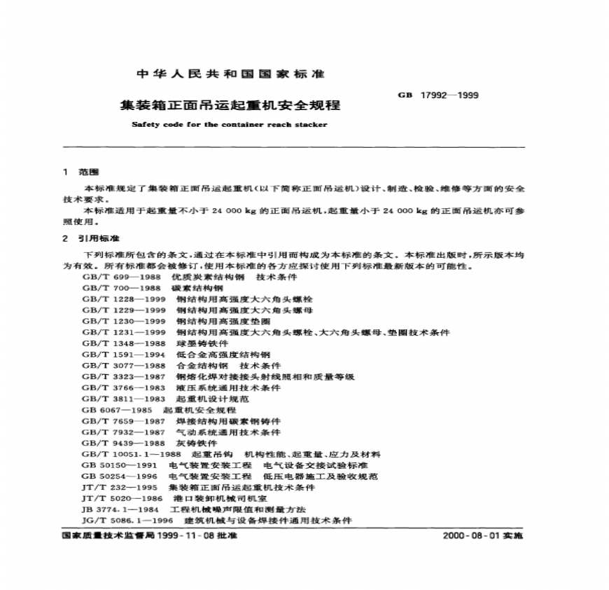 GB 17992-1999 集装箱正面吊运起重机安全规程资料下载,喜欢的朋友可以下载收藏!
