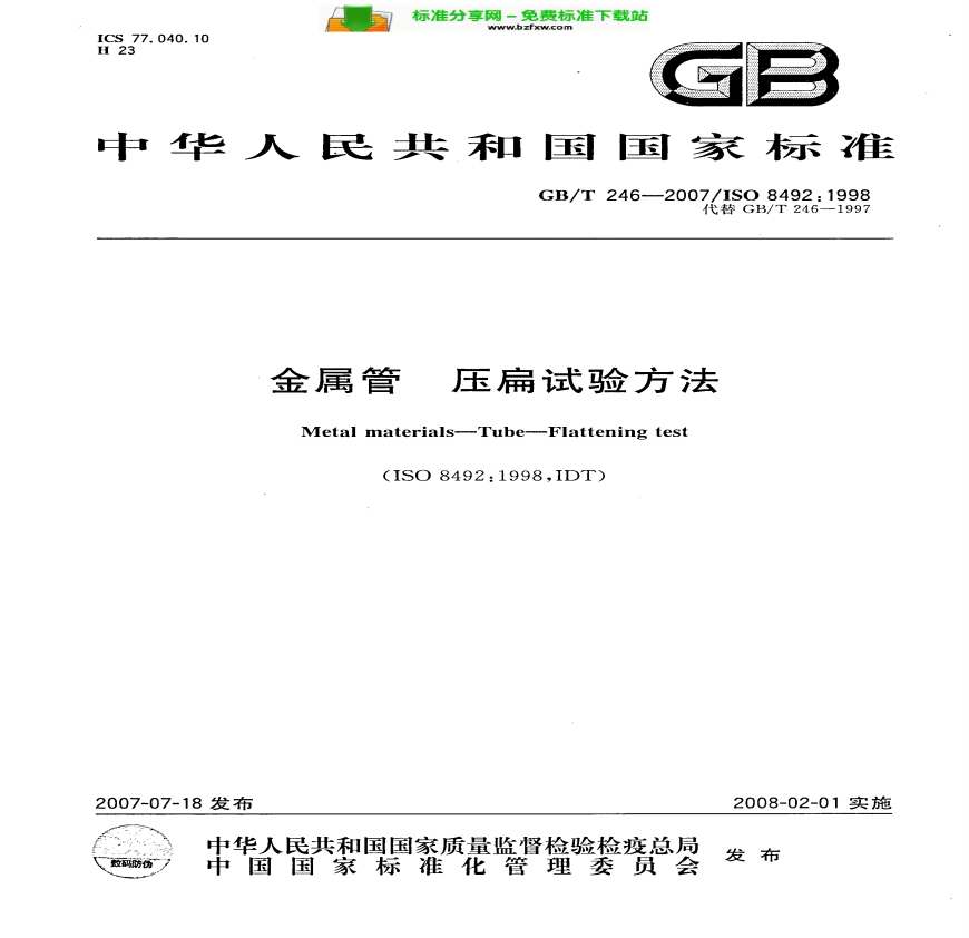GB246-2007T金属管 压扁试验方法.pdf 免费下载