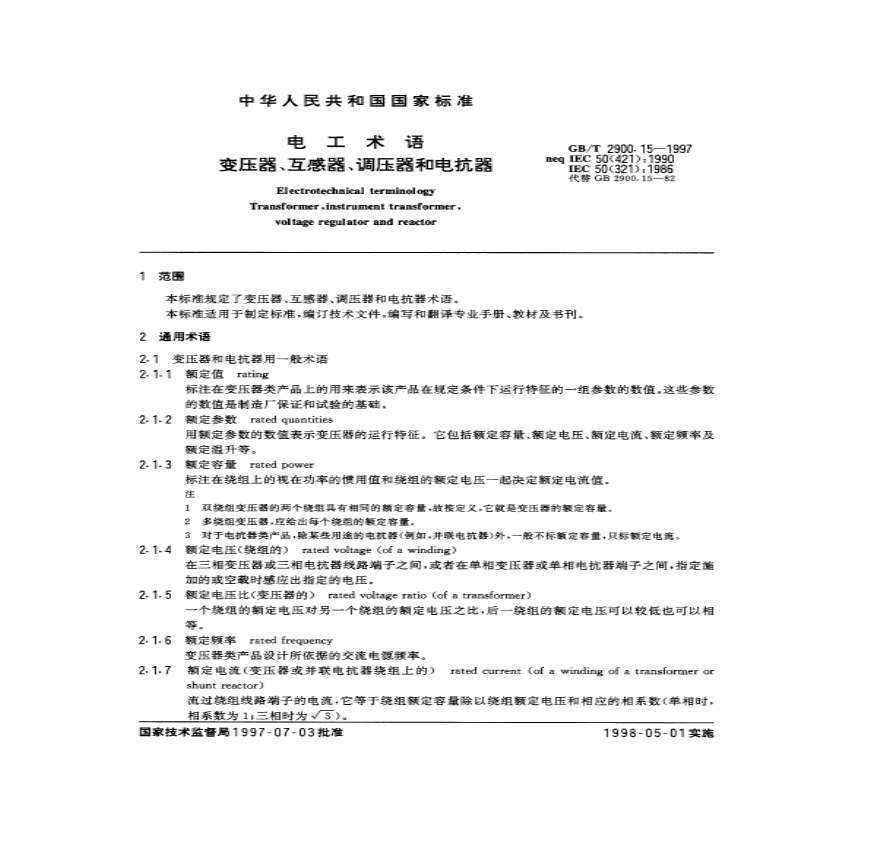 GB 2900.15-1997 电工术语 变压器、互感器、调压器和电抗器.pdf 免费下载