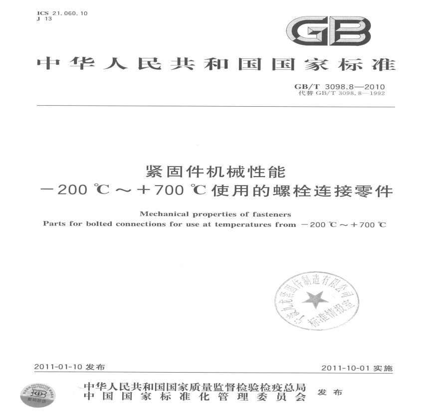 > GB 3098.8-2010-T 紧固件机械性能 -200℃~+700℃使用的螺栓连接
