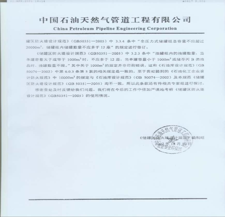 > GB 50351-2005对《关于执行《储罐区防火堤设计规范》遇到的问题