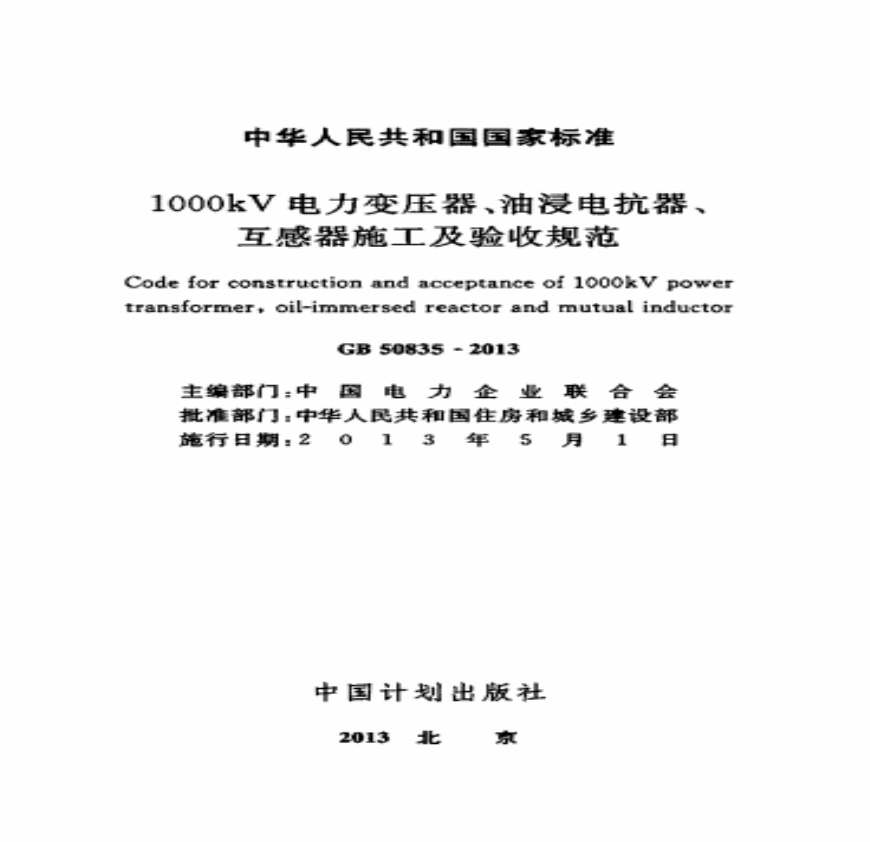 GB50835-2013 1000kV电力变压器、油浸电抗器、互感器施工及验收.pdf 免费下载