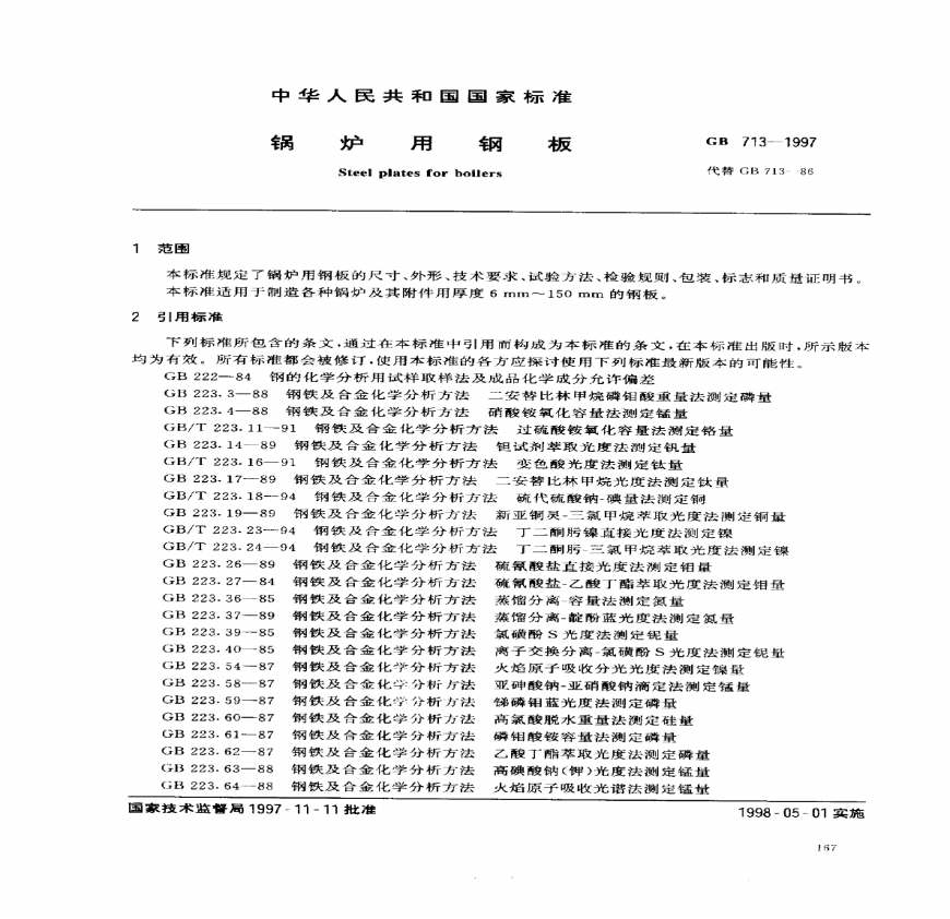 国家标准(GB)本标准规定了锅炉用钢板的尺寸、外形、技术要求、试验方法、检验规则、包装、标志和质量证明书。