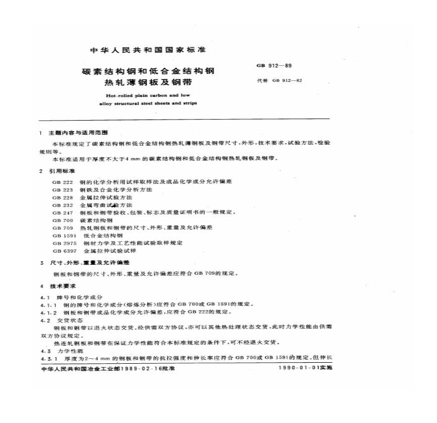 > GB912-89 碳素结构钢和低合金结构钢热轧薄钢板及钢带