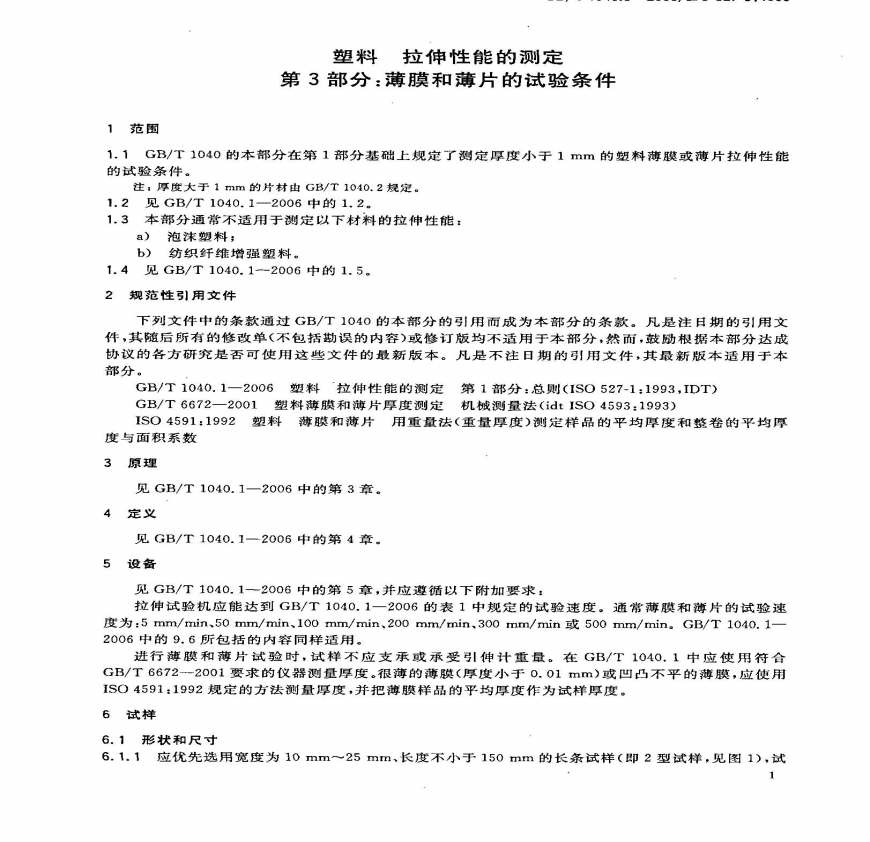 > GB-T 1040.3-2006 塑料 拉伸性能的测定 第3部分:薄塑和薄片的试