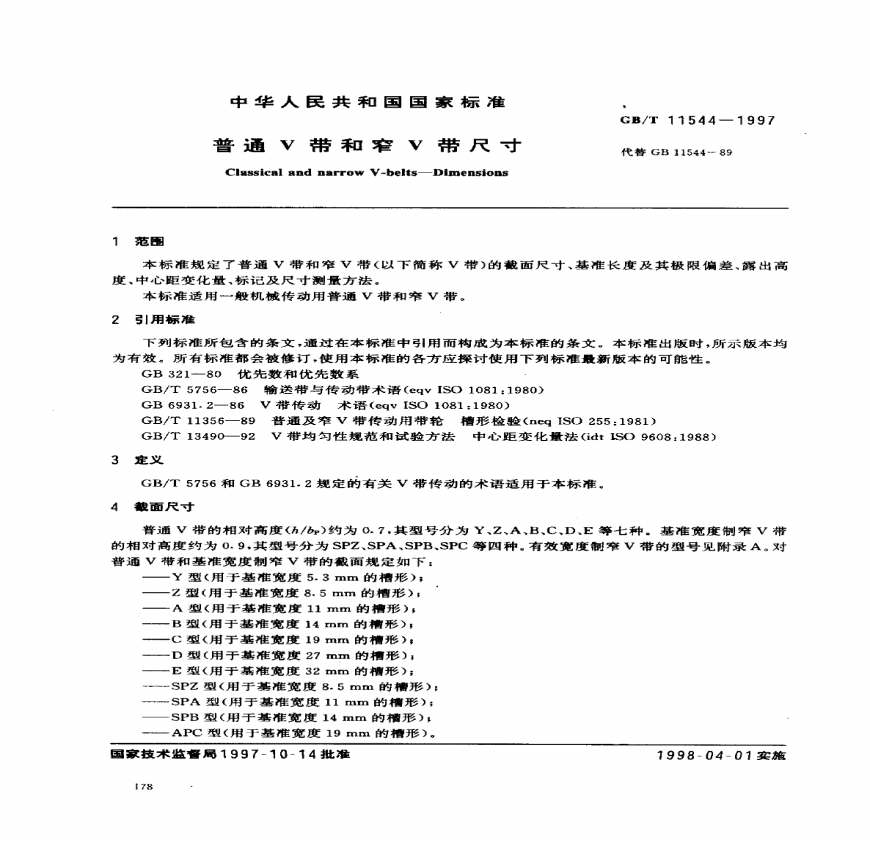 国家标准(GB)本标准规定了普通V带和窄V带的截面尺寸、基准长度及其极限偏差、露出高度、中心距变化量、标记及尺寸测量方法。