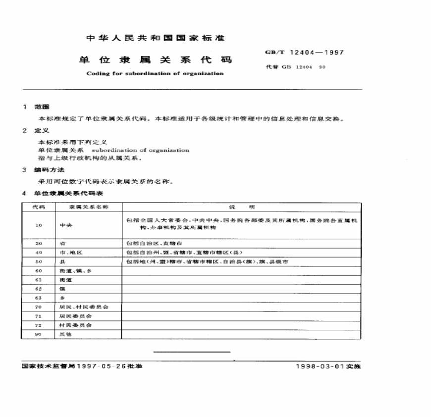 > GBT 12404-1997 单位隶属关系代码