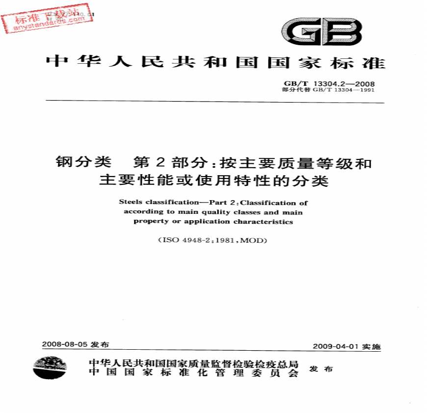 > GBT13304.2-2008钢分类+第2部分:按主要质量等级和主要性能或使