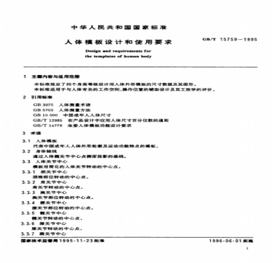国家标准(GB)本标准规定了四个身高等级设计用人体外形模板的尺寸数据及其图形。