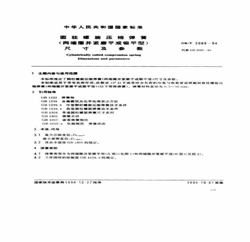 > GB T2089-1994 圆柱螺旋压缩弹簧(两端圈并紧磨平或锻平型)尺寸及