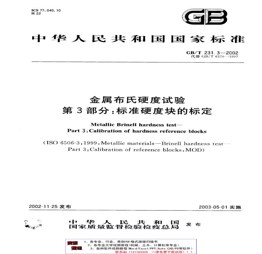 GBT 231.3-2002金属布氏硬度试验 第3部分标准硬度块的标定资料下载,喜欢的朋友可以下载收藏!