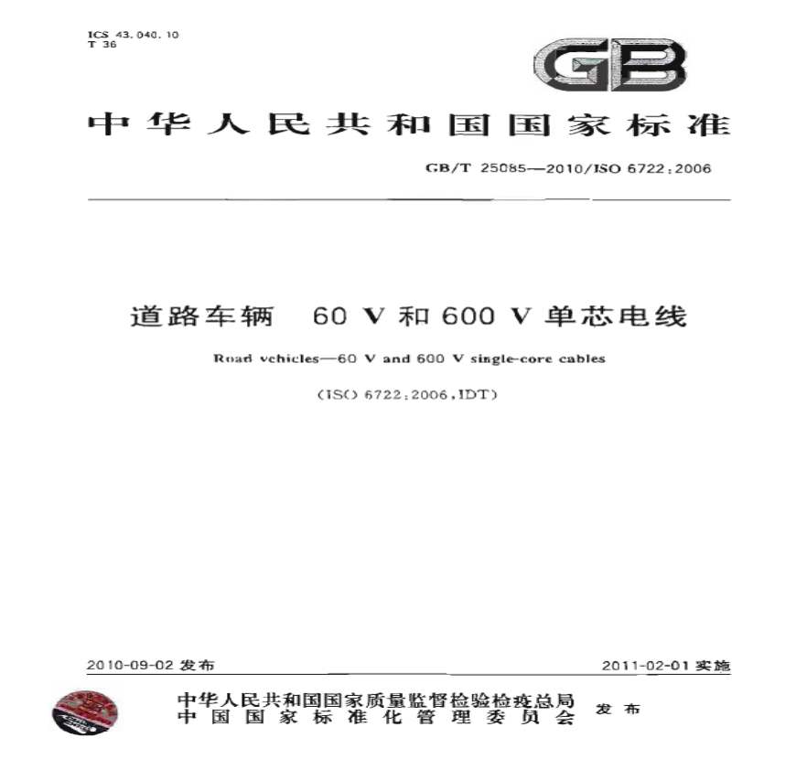 > GBT 25085-2010 道路车辆60V和600V单芯电线