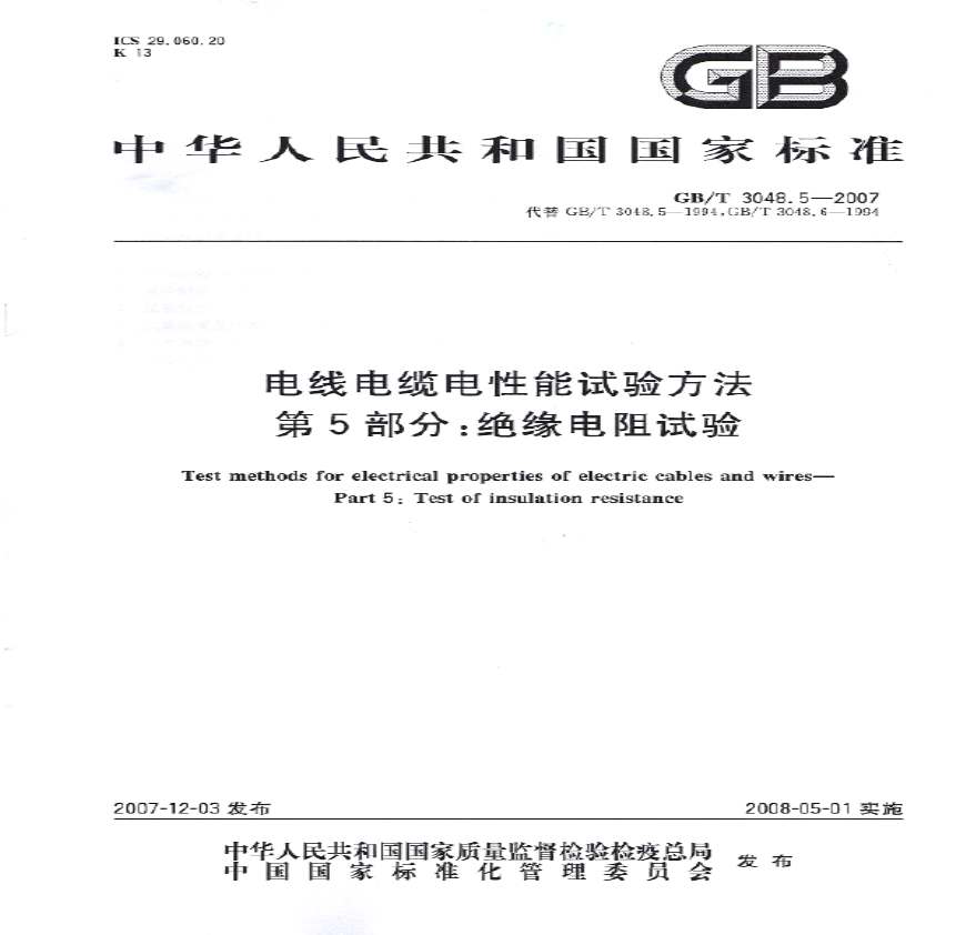 GB/T 3048.5-2007 电线电缆电性能试验方法-绝缘电阻试验资料下载,喜欢的朋友可以下载收藏!