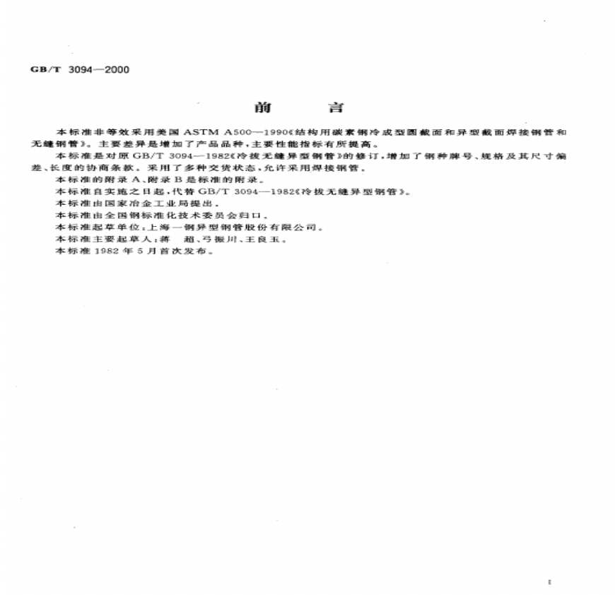 国家标准(GB)本标准规定了冷拔异型钢管的分类、代号、外形、尺寸及允许偏差、技术要求、试验方法、检验规则、包装、标志和质量证明书。