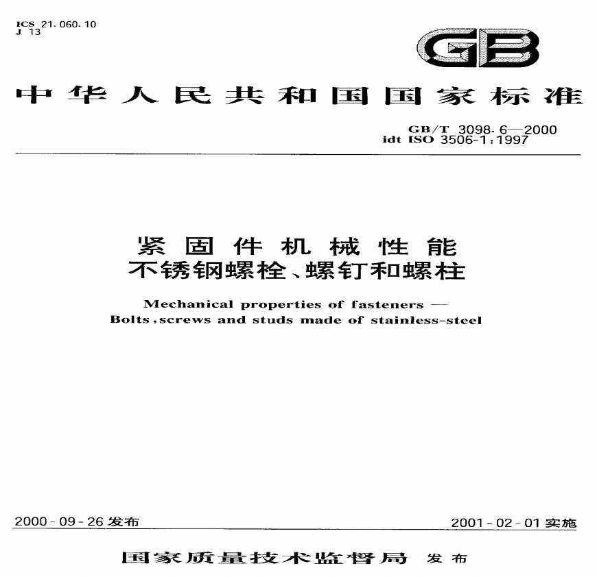 > GBT3098[1].6-2000紧固件机械性能(不锈钢螺栓、螺钉)